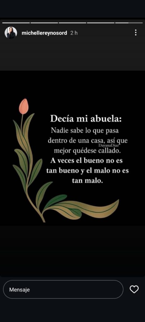 A través de una historia en su cuenta de Instagram, Reynoso escribió una frase que ha desatado múltiples interpretaciones: “Decía mi abuela, nadie sabe lo que pasa dentro de una casa, así que quédese callado. A veces el bueno no es tan bueno y el malo no es tan malo”.